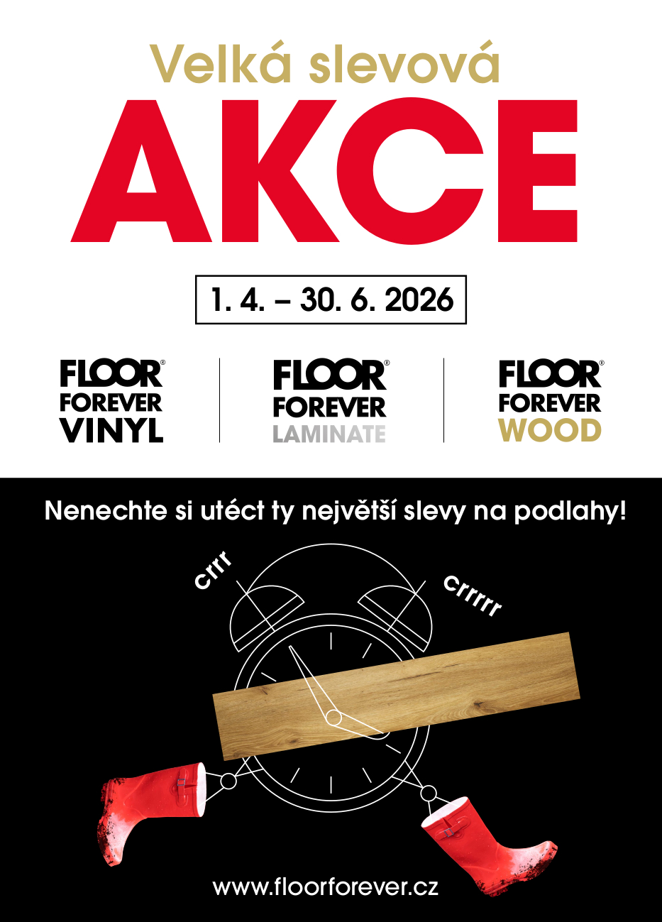 - Velká slevová akce - nenechte si utéct největší slevy na vinylové, dřevěné a laminátové podlahy FLOOR FOREVER! Slevy až do výše 35 % a výběr tak široký, že bude nejlepší, když se přesvědčíte u nás na vzorkovně. :-) Akce trvá od 1. 4. do 30. 6. 2026.