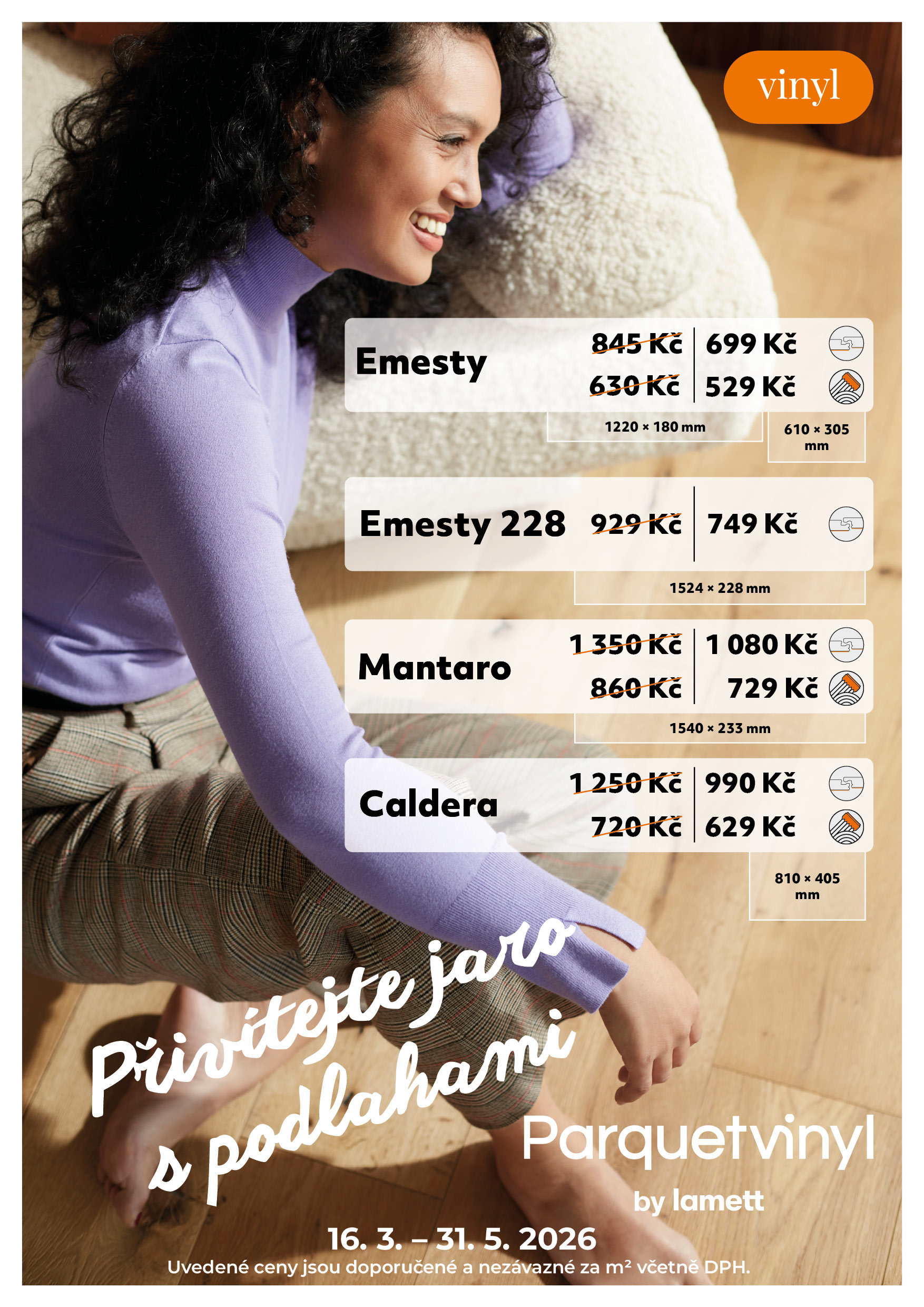 - Přivítejte jaro s podlahami! Vinylové podlahy Parquetvinyl (se systémem click nebo lepené) ve vybraných řadách Emesty, Emesty 228, Mantaro a Caldera nyní za akční ceny. Nabídka platí od 16. 3. do 31. 5. 2026.